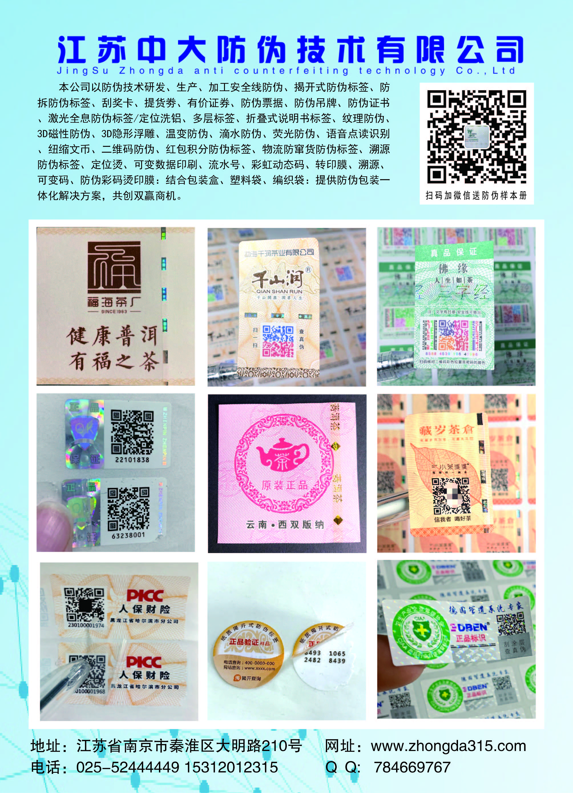 江蘇中大防偽技術有限公司以防偽技術研發、生產、加工安全線防偽、揭開式防偽標簽、防拆防偽標簽、刮獎卡、提貨劵、有價證券、防偽票據、防偽吊牌、防偽證書、激光全息防偽標簽/定位洗鋁、多層標簽、折疊式說明書標簽、紋理防偽、3D磁性防偽、紅包積分防偽標簽、物流防竄貨防偽標簽、溯源防偽標簽、定位燙、彩虹動態碼、轉印膜、溯源、可變碼、防偽彩碼燙印膜:結合包裝盒、塑料袋、編織袋:提供防偽包裝一體化解決方案,共創雙贏商機。