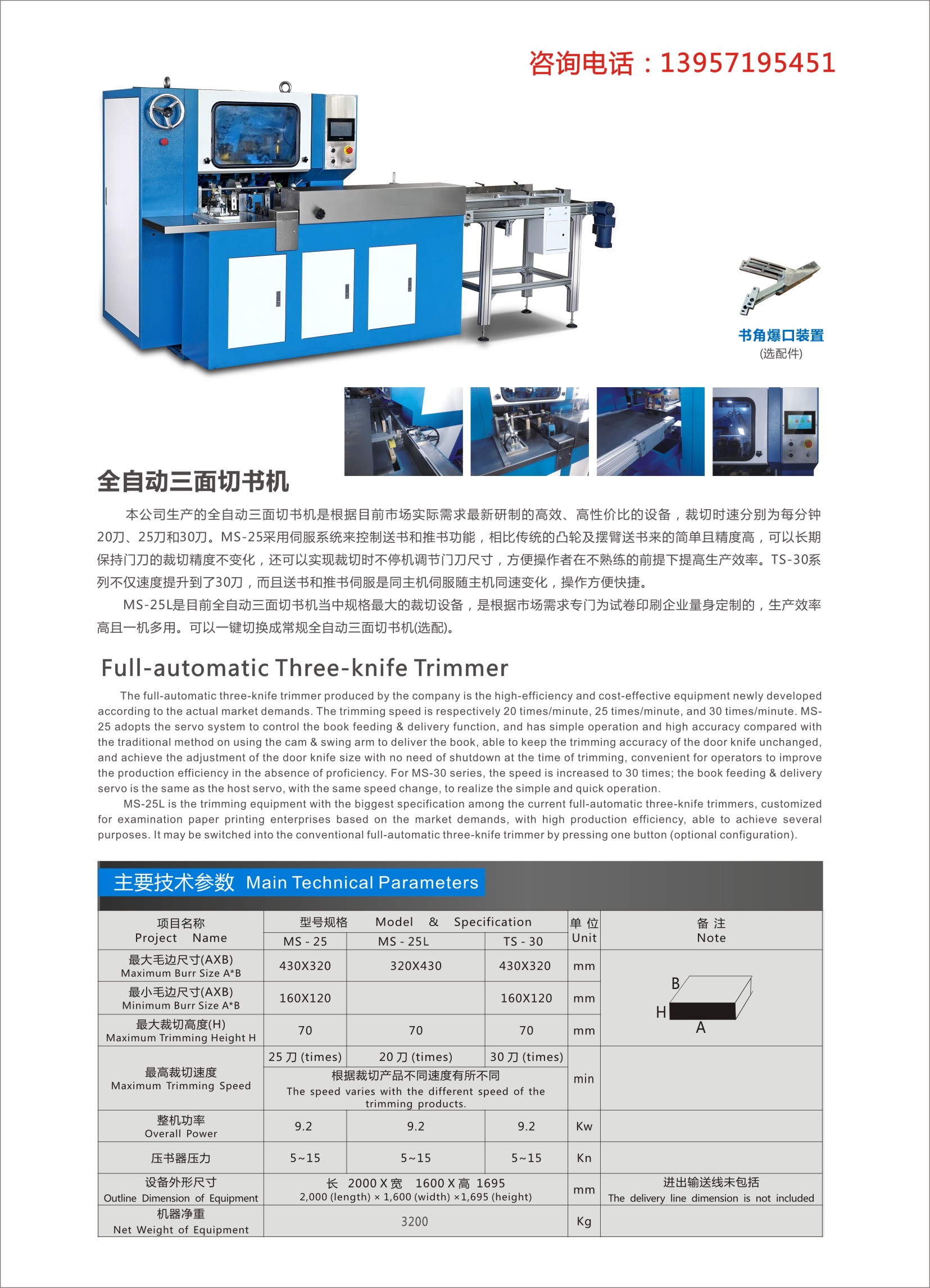 The full-automatic three-knife trimmer produced by the company is the high-efficiency and cost-effective equipment newly developed according to the actual market demands. The trimming speed is respectively 20 times/minute, 25 times/minute, and 30 times/minute.