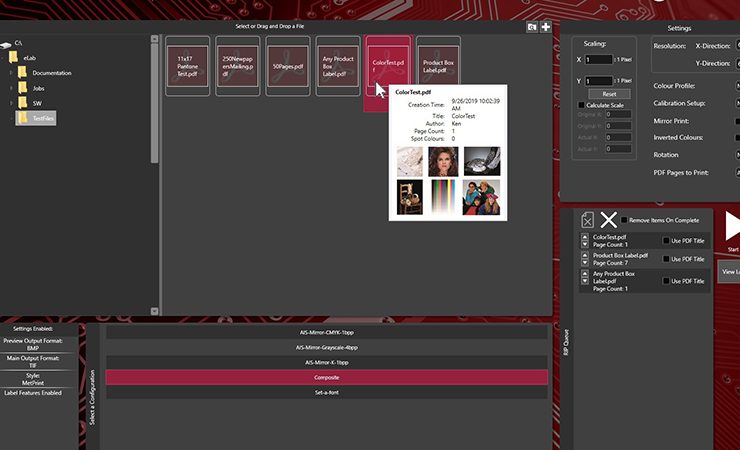 Operating efficiently on the same PC as MetPrint or any DFE running Meteor’s PrintEngine, eLab Pro can reduce the cost of computing power and switches for industrial print applications. Used together with a spectrophotometer and ICC profile creation software, such as that provided by ColorLogic or X-Rite, colour management and precision spot colour matching capabilities are available. For high-speed book printing or adding variable data to labels and packaging, eLab Pro is available with Meteor’s Scalable RIP Farm where multiple RIPS run in parallel.