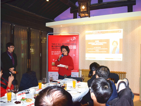 On January 15, 2016, All in Print China held its Spring Festival Gala Dinner & Information Communication Meeting in Beijing. The organizers of All in Print celebrated the Chinese New Year and discussed the latest development of the exhibition with colleagues in the printing industry in Beijing together. Mrs. Wang Yanbin (Director General of Department of Printing and Distribution, State Administration of Press, Publication, Radio, Film and Television of the People's Republic of China , President of the Printing Technology Association of China), Mr. Liang Chenglin (Deputy Executive President of the Printing Technology Association of China), Mrs. Chen Yan (President of China Academy of Printing Technology and Vice President & Secretary General of the Printing Technology Association of China), Mr. Axel Bartkus (General Manager of Messe Düsseldorf (Shanghai) Co.,Ltd.) and over 30 representatives of famous Chinese and foreign manufacturers like Heidelberg, KBA, Manroland, Founder Electronics, Epson, Beiren, Dinga, Sino-MV, Watanabe Tsusho and Luster Light Tech participated in this activity.