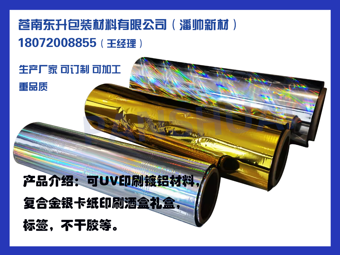公司主要產品有:PET OPP CPP PVC彩色鍍鋁膜 鐳射膜,觸感膜,可UV印刷鍍鋁膜,標簽膜,可轉移彩色鍍鋁膜,金銀卡紙復合膜 淋膜,各類多功能涂布薄膜 。產品廣泛應用于 紙張UV印刷 標簽卷筒印刷 無紡布淋膜等各個領域,遠銷歐美亞非等國家。我們產品有SGS ISO9001 等認證證書,并注冊 潘帥 PANSHUAI 兩類商標,努力打造品牌質量.