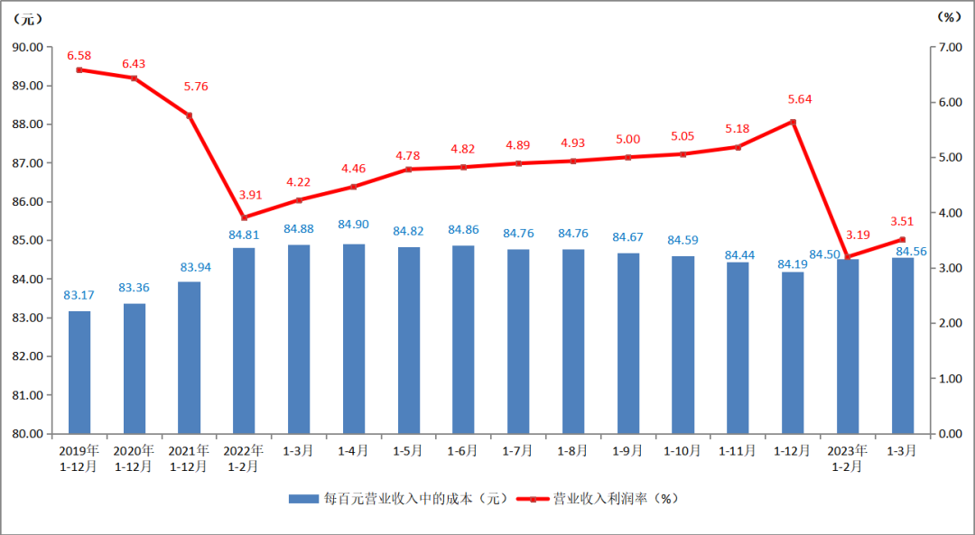 2023年1-3月,印刷業(yè)每百元營業(yè)收入中的成本為84.56元,低于全部工業(yè)85.04元的平均水平。但這一數(shù)字,相比印刷業(yè)去年全年84.19元,有所提升。