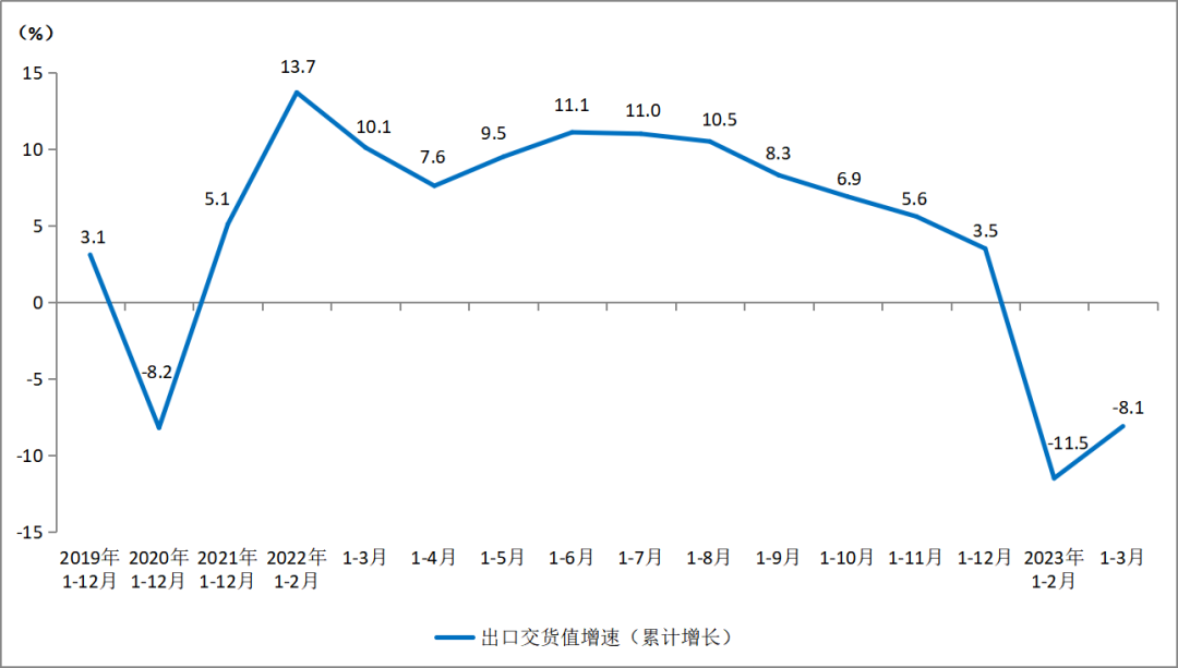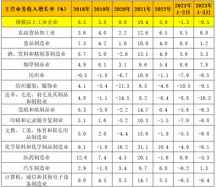 表中顯示,2023年1-3月全部工業(yè)主營業(yè)務(wù)收入平均增長為-0.5%,較上月降幅收窄。