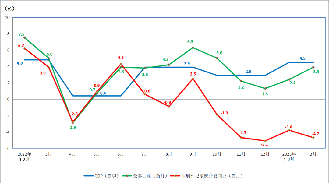 但印刷業(yè)并未在增長陣列。2023年3月,印刷業(yè)工業(yè)增加值的同比增速為-4.7%,相比1-2月的-3.8%,降幅有所擴(kuò)大,與全部工業(yè)相比出現(xiàn)不同的增速軌跡。