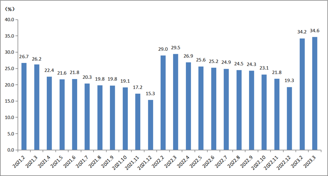 2023年3月,印刷業(yè)規(guī)模以上企業(yè)的虧損面為34.6%,虧損企業(yè)的虧損總額增長了32.3%。圖3顯示了自2021年以來各月的虧損面情況,可以明顯看出,今年各月規(guī)上印刷企業(yè)的虧損面相比去年同期明顯上了一個臺階,超三分之一的企業(yè)尚陷于虧損的經(jīng)營局面。