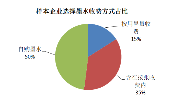 如圖9所示,樣本企業中,其中選用含在按張收費中的占35%,選用按用墨量收費的占15%,此外還有50%的可以自購墨水。