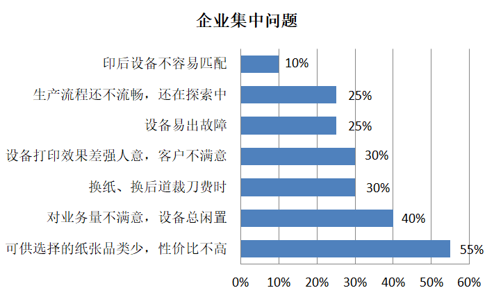 選擇“設備易出故障”和“生產流程還不流暢,還在探索中”分別占比25%。選擇“設備易出故障”的企業,他們所使用的設備國產進口皆有,各種品牌皆有,所以這應該是高速噴墨印刷技術在發展過程中的問題。選擇“生產流程還不流暢,還在探索中”的企業,類型以商業印刷和圖文快印為主,說明高速噴墨印刷進入這兩個領域時間較短,尚未形成成熟的生產流程體系。