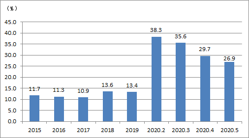 2020年5月,印刷業(yè)規(guī)模以上企業(yè)的虧損面為26.9%。圖3可見,自2月以來,虧損面逐月減少,越來越多的企業(yè)擺脫了短期性虧損的困境。不過,與去年底13.4%的虧損面相比,目前數(shù)值依然翻番,仍處于比較嚴(yán)峻的狀態(tài)。