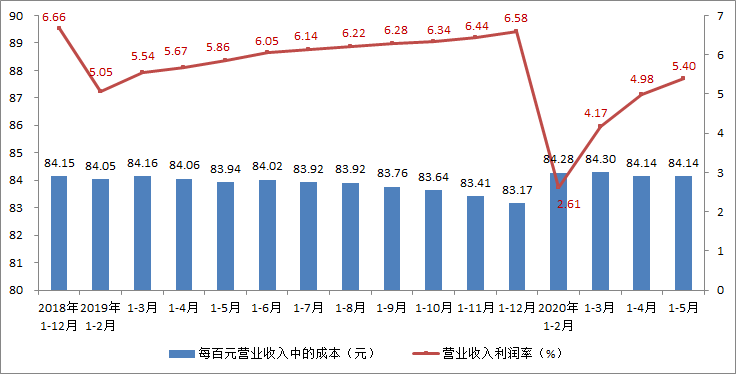 2020年1-5月,印刷業(yè)每百元營業(yè)收入中的成本為84.14元,與1-4月的數(shù)值相同,略低于全部工業(yè)84.77元的平均水平。