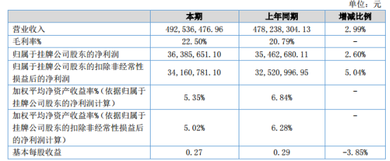 根據天元集團公布的2019年半年財報顯示,截止2019年6月30日,2019上半年營業收入為4.93億元,較上年同期增長2.99%;歸屬于掛牌公司股東的凈利潤為3638.57萬元,較上年同期增長2.60%;基本每股收益為0.27元,較上年同期減少3.85%。