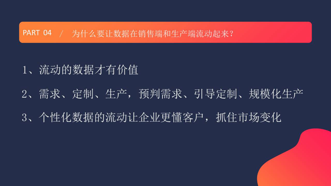 像交易數據、生產數據、財務數據,如果形成不了聯動,就無法創造價值。我們應該通過數據的流動檢測、分析,將原來的被動需求逐漸轉變為預判需求、引導定制、規?;a,充分將智能制造工業4.0的投入發揮到最大價值。個性化的數據流動會讓企業更懂客戶,更容易抓住市場變化,自然未來的增長機會就屬于你。