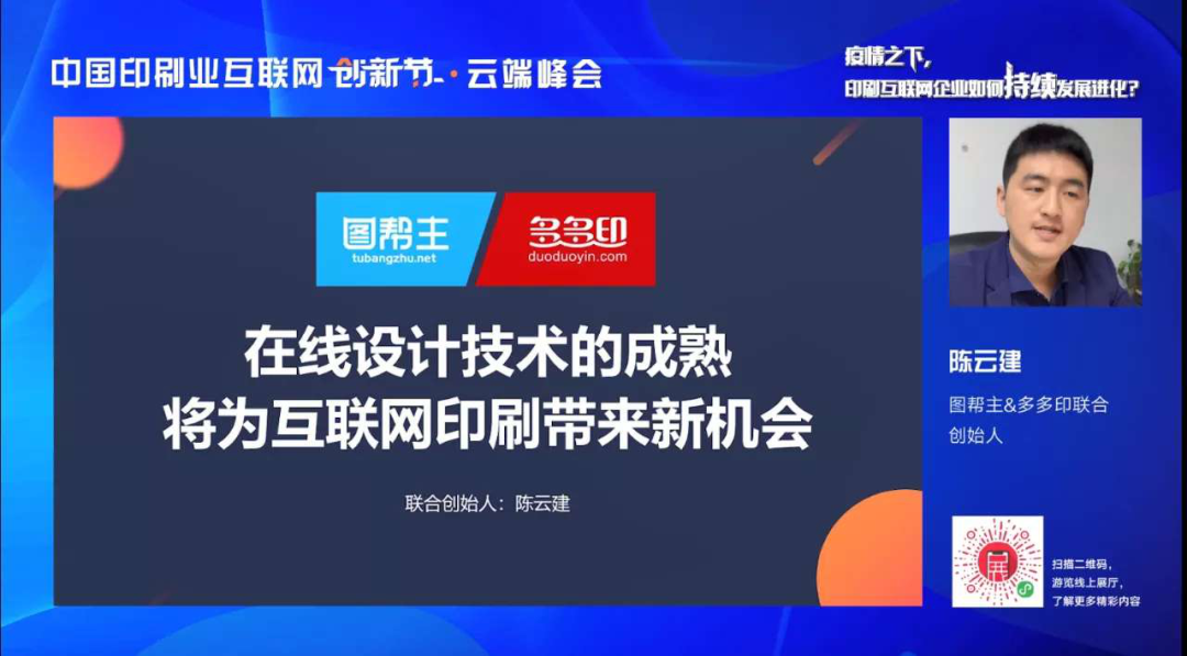 2020年5月26日,由中國印刷科學技術研究院、科印傳媒主辦,科印網承辦、阿里巴巴作為戰略支持的2020中國印刷業互聯網創新節·云端峰會在線上成功拉開帷幕。會上,圖幫主&多多印聯合創始人陳云建以《在線設計技術的成熟將為互聯網印刷帶來新機會》為題進行了分享,以下為演講整理。