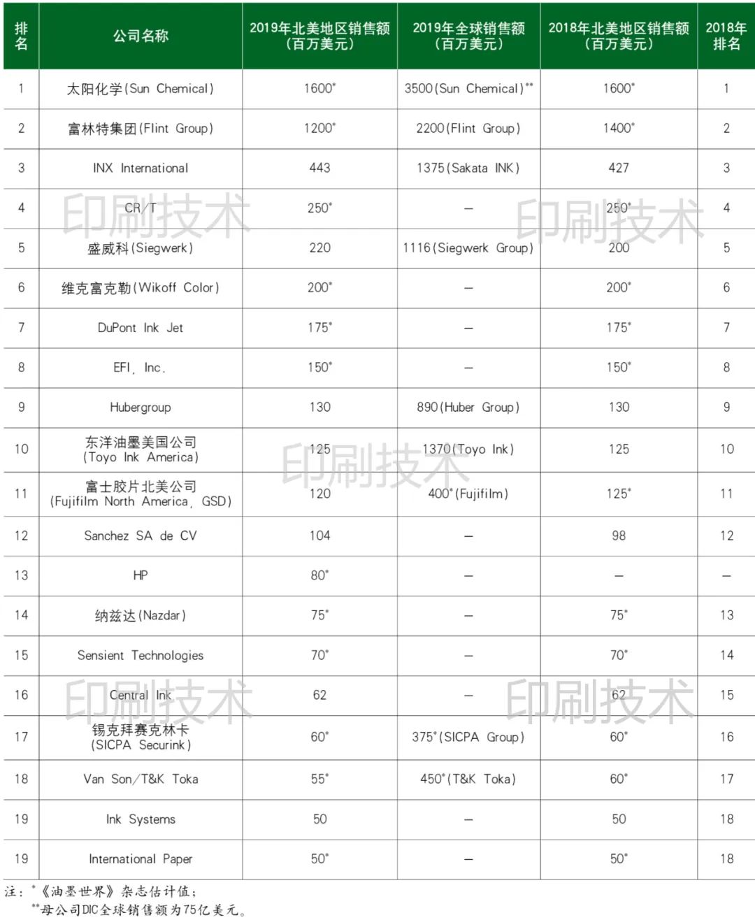 2019年北美地區(qū)油墨銷售額前20強榜單發(fā)布!