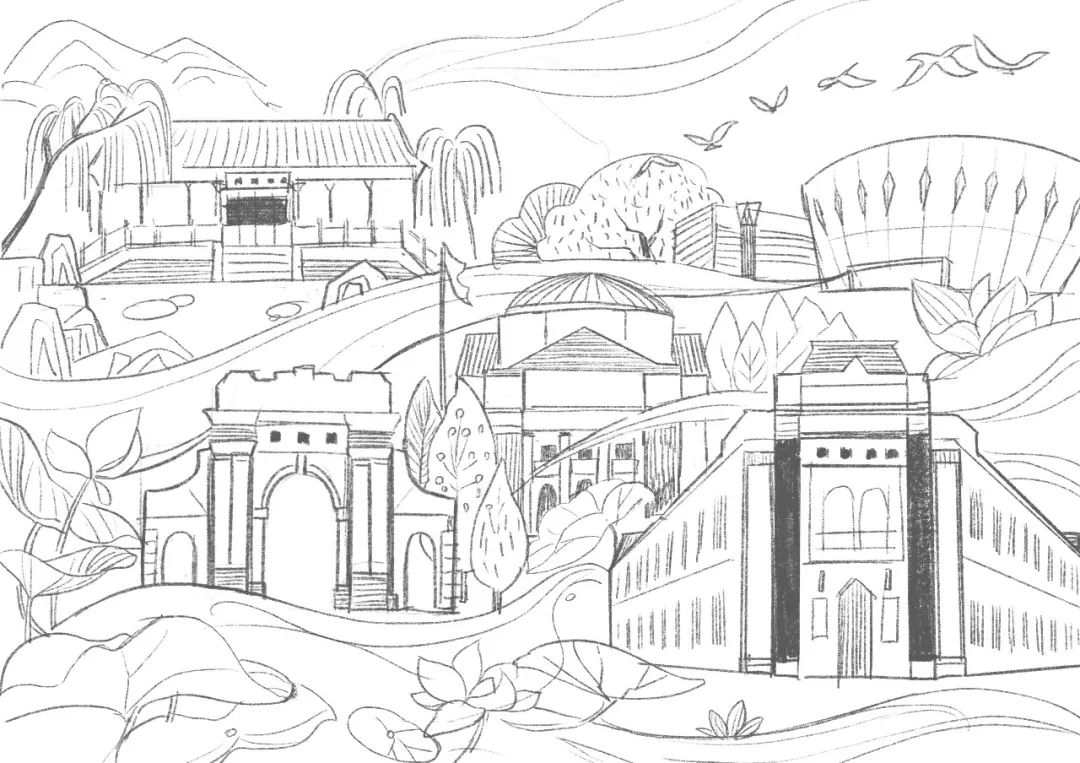 折頁背面是山大八景圖,八校區的標志性建筑坐落在青黛碧波間。風琴折頁共長一百二十厘米,象征著百廿校慶。