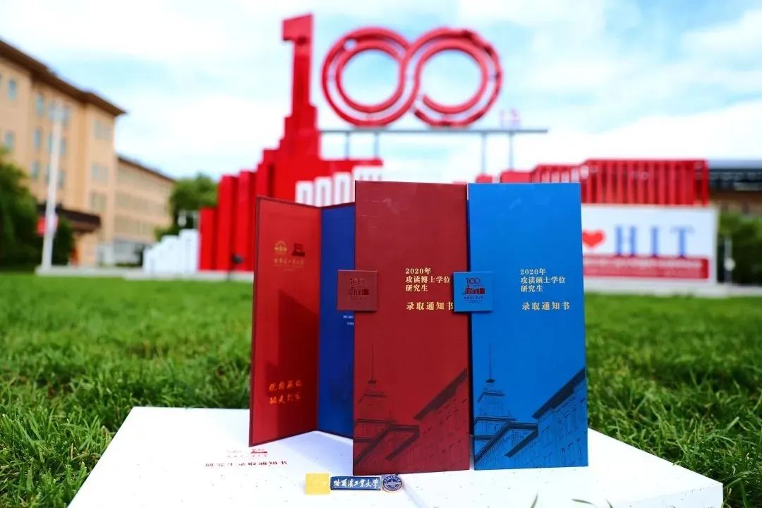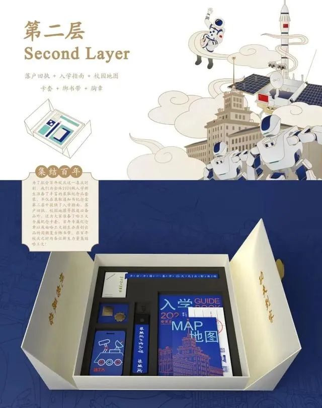 錄取通知書以建校百年為主題,由紅、藍兩色的通知書和不同年代的?;战M合兩部分組成,通知書封面以建校百年標識為主形,封面右下角配以學校主樓暗紋,寓意百年哈工大深厚的歷史積淀與科研實力。