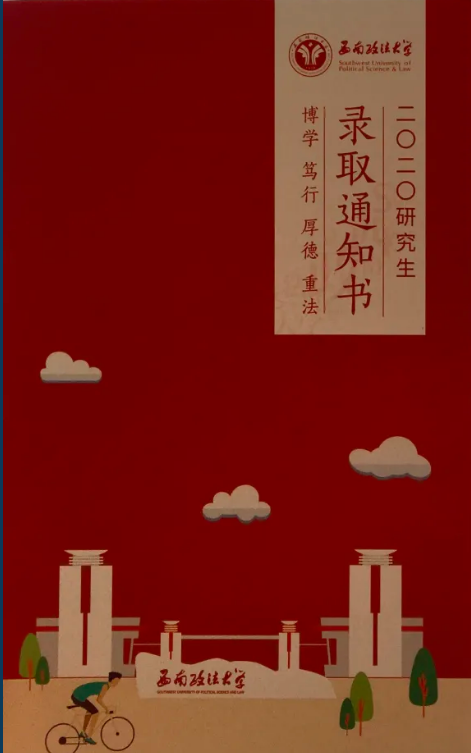 通知書背面以紅白色為主色調,同時以“博學樓”和”東校門“為搭配,使通知書呈現簡約大方的藝術風格,與正面的細膩柔和構成審美的張力。
