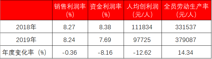 在這一表中,我們發現76家企業,無論是銷售利潤率、資金利潤率、人均創利潤均呈現下降趨勢。其中,銷售利潤率下降0.36%,資金利潤率下降8.16%,人均創利潤下降12.62%。其中后兩者降幅明顯,印刷企業在2019年所承受的經營壓力可見一斑。但由于全行業自動化水平逐年提高,76家百強企業兩年間的全員勞動生產率增長了14.34%,減員增效效果明顯。
