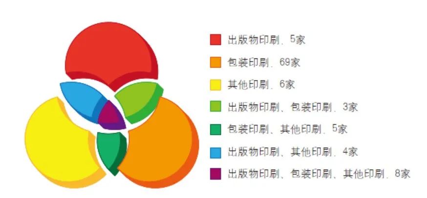 百強企業的業務結構,請見圖5。圖中以3個圓分別表示從事出版物印刷、包裝印刷、其他印刷的企業數量,3個圓的相交部分表示各項業務的交叉情況。