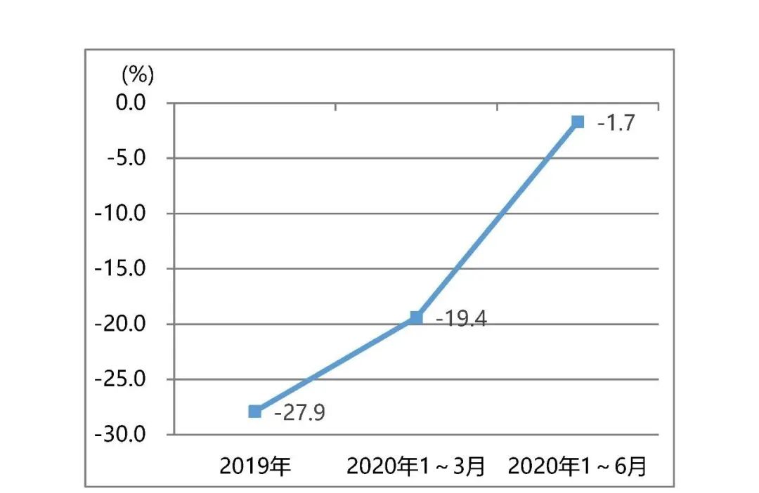 印前設(shè)備進(jìn)口同樣得到改善,2020年1~6月同比下降6.8%,其2020年1~3月降幅達(dá)22.4%,如圖7所示。