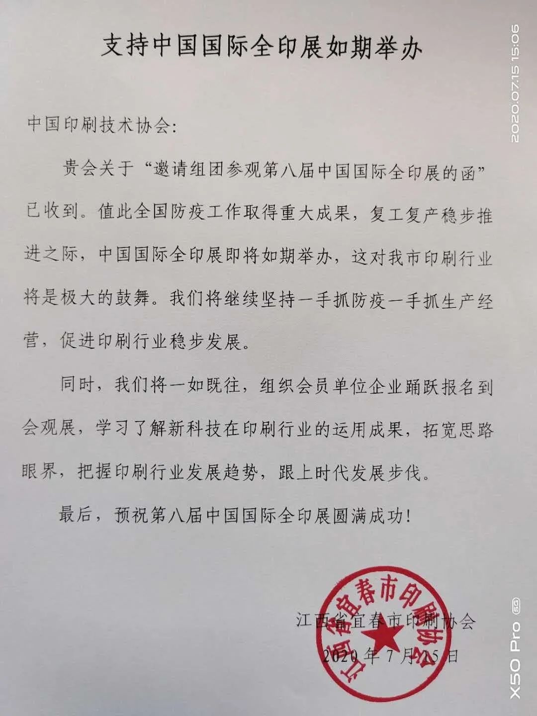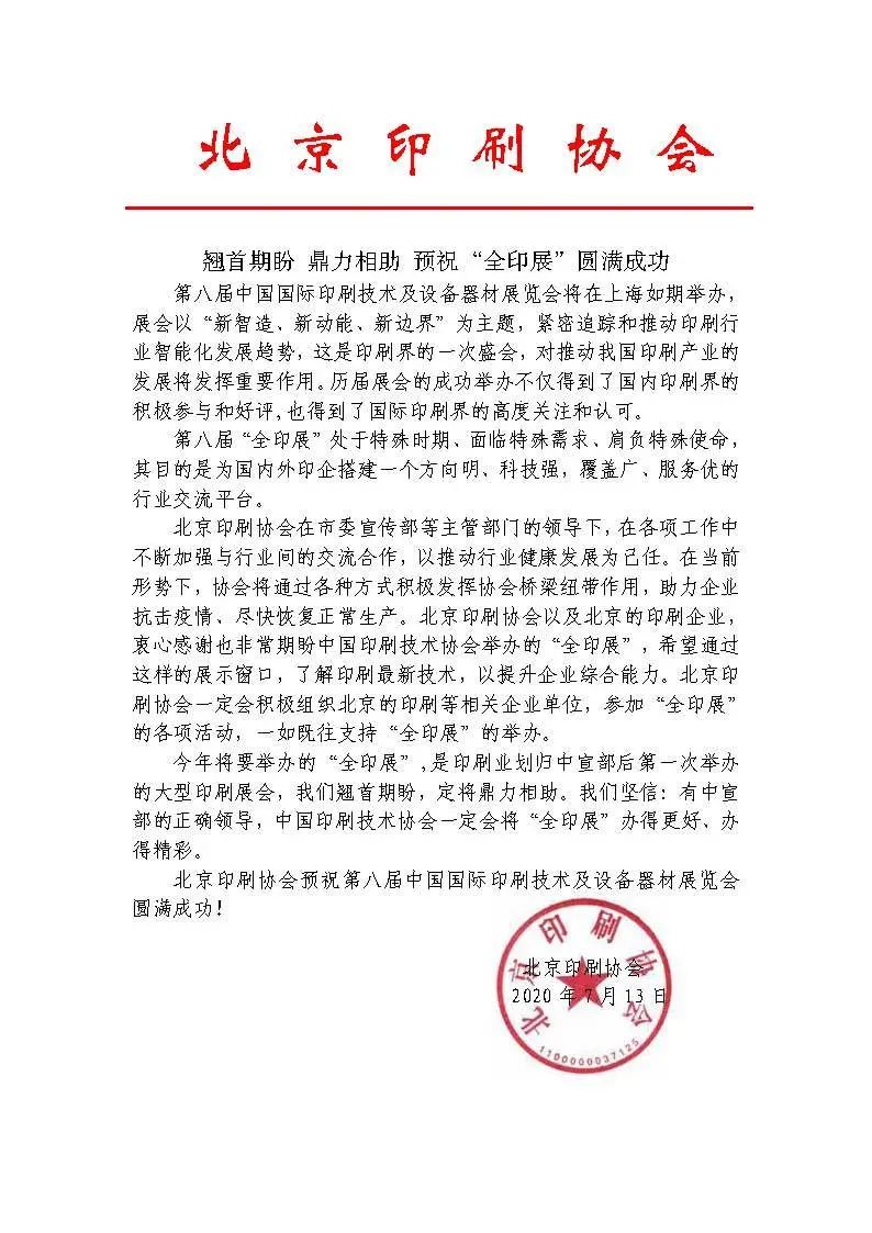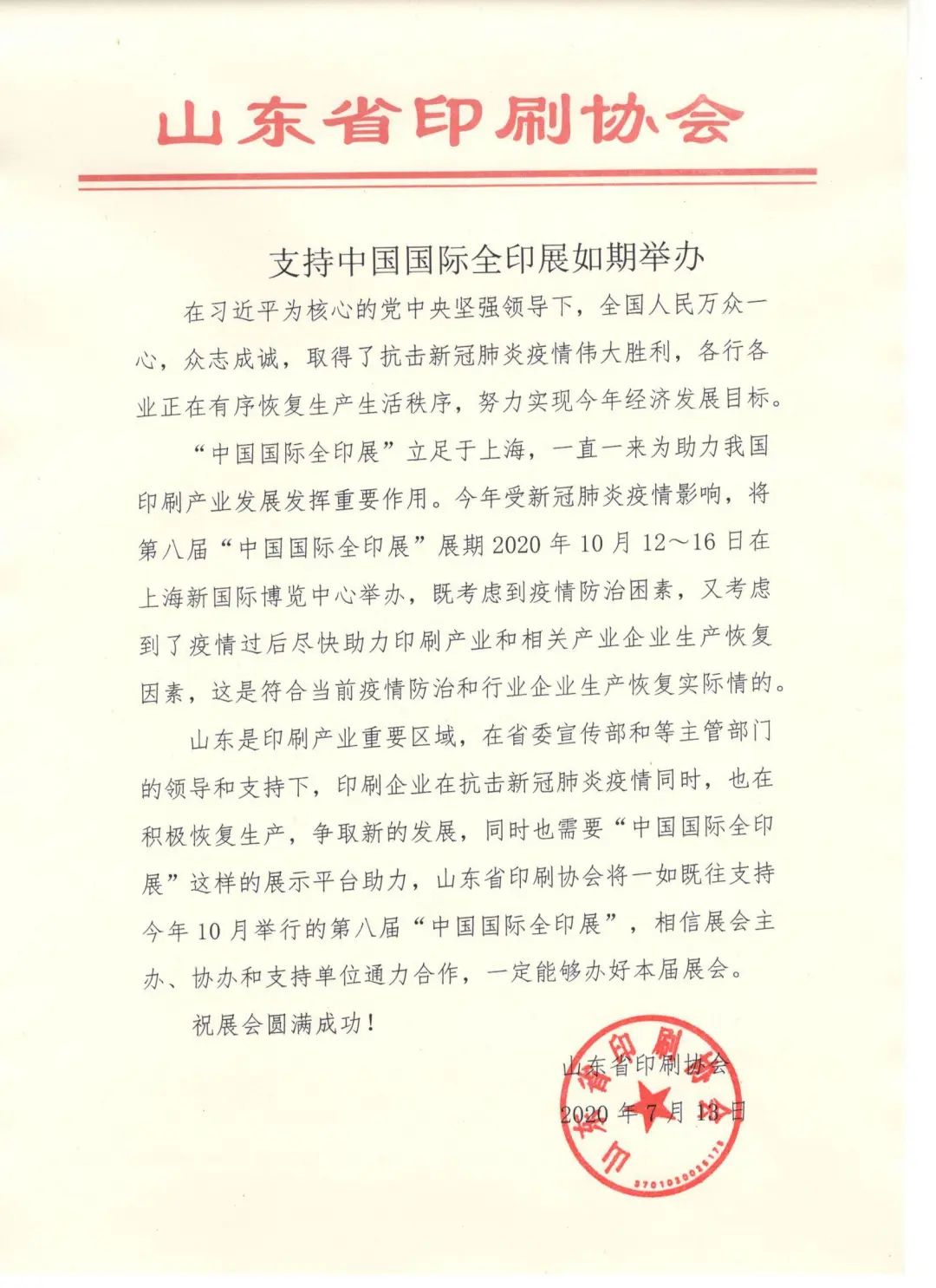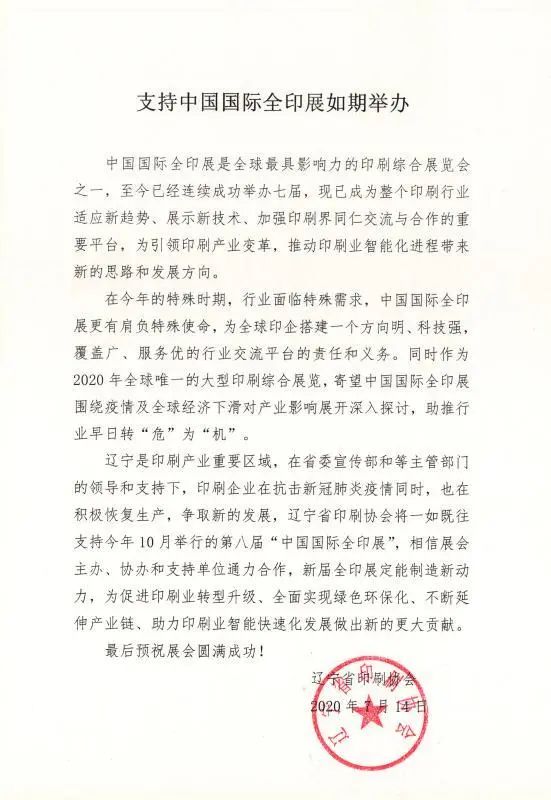 感謝以上協會特意來函的拳拳心意,也感謝全國各省市行業協會的積極支持和幫助,全印展將繼續動員全行業力量,舉辦更高質量的展會,為疫情后印刷業貿易投資、技術交流搭建一個絕佳的交流展示平臺,為行業的快速發展貢獻一份力量!