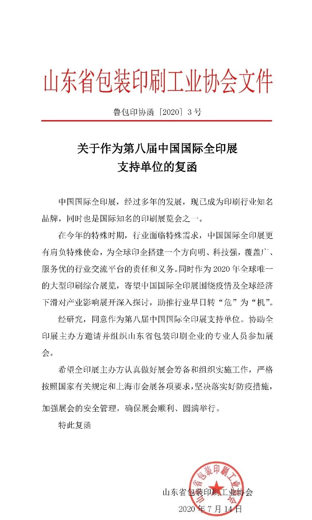 山東省包裝印刷工業協會愿意作為第八屆中國國際全印展支持單位,協助全印展主辦方邀請并組織山東省包裝印刷企業的專業人員參加展會。希望全印展主辦方認真做好展會籌備和組織實施工作,嚴格按照國家有關規定和上海市會展各項要求,堅決落實好防疫措施,加強展會的安全管理,確保展會順利、圓滿舉行。