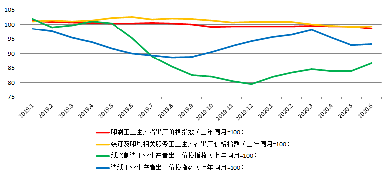 2020年1-6月,印刷與裝訂的價格指數變化相對平穩,但基本在100線下方窄幅波動,表明印刷市場仍承受一定的降價壓力。