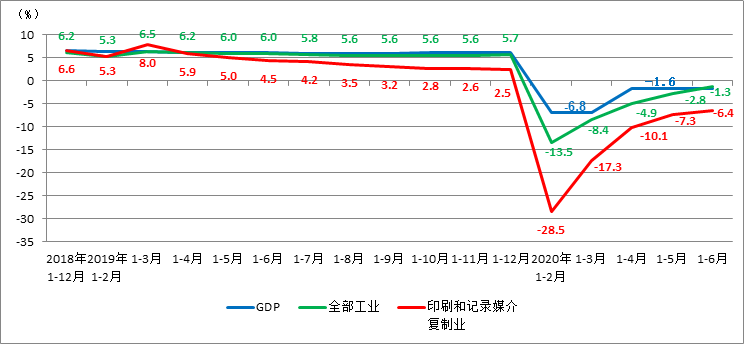 2020年1-6月,印刷業規模以上企業實現營業收入,同比下降9.5%;實現利潤總額,同比下降13.8%。兩項指標繼續呈現觸底后的回升態勢,但回升速度放緩,行業仍面臨不少困難和市場壓力。