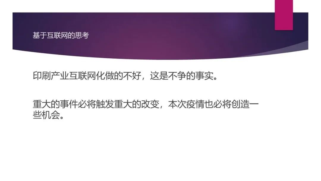 這也為我們帶來了蘊藏的機會,在一些極端環(huán)境下,低也意味著爆發(fā)的到來。大家可能都清楚,17年前的非典促成了C端電子商務的爆發(fā),而對于印刷互聯(lián)網(wǎng)來說,B端是非常重要的成分,特別是當下個性化印刷的迅速發(fā)展。而重大事件必將觸發(fā)重大改變,此次疫情可能會成為推進印刷行業(yè)互聯(lián)網(wǎng)化的一個機會。