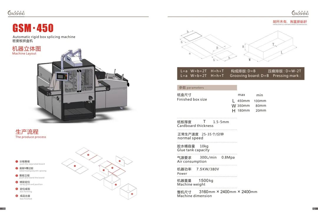 本機采用了國內首創的三板制盒工藝極大的節省了四角材料,設備底板采用了獨特的分板下抽式送料,實現不停機加料,大大提高了生產效率。熱熔膠噴膠粘盒工藝取代了以往膠帶粘盒工藝,轉角部位棱角分明,尺寸精準使得做出的成品盒更加美觀,很好的滿足了用戶對精品包裝的需求。而拼板工藝作為一種節能降耗、提升包裝視覺效果的印后加工方式,為該設備帶來了更多優勢。