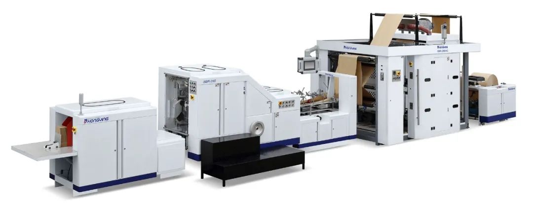 全自動(dòng)紙袋機(jī)用于制作帶手挽的方底紙袋,是由手挽機(jī)將挽繩和貼片卷筒紙制成把手,通過輸送裝置將手把送至貼把機(jī)組,貼把機(jī)組將原色或者印刷好的卷筒紙進(jìn)行貼片位點(diǎn)斷,貼片位涂膠,自動(dòng)粘貼手把,再由主機(jī)將貼有手把的紙張進(jìn)行涂邊膠,成紙筒,切斷,底部壓痕,底部涂膠,袋底成型并輸送出袋。整個(gè)過程同步完成。該設(shè)備生產(chǎn)效率高,大大降低了人工成本,是生產(chǎn)手挽袋的理想設(shè)備