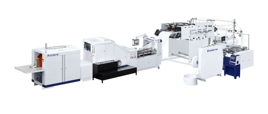 全自動紙袋機用于制作帶手挽的方底紙袋,是由手挽機將挽繩和貼片卷筒紙制成把手,通過輸送裝置將手把送至貼把機組,貼把機組將原色或者印刷好的卷筒紙進行貼片位點斷,貼片位涂膠,自動粘貼手把,再由主機將貼有手把的紙張進行涂邊膠,成紙筒,切斷,底部壓痕,底部涂膠,袋底成型并輸送出袋。整個過程同步完成。該設備生產效率高,大大降低了人工成本,是生產手挽袋的理想設備