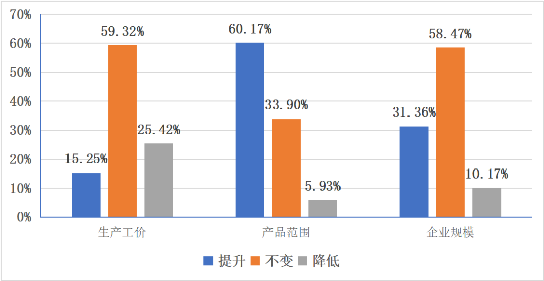 疫情之下,企業(yè)如何調(diào)整經(jīng)營策略?我們選取了“生產(chǎn)工價”“產(chǎn)品范圍”“企業(yè)規(guī)模”三個指標,一窺企業(yè)對于經(jīng)營策略調(diào)整情況,見圖9。