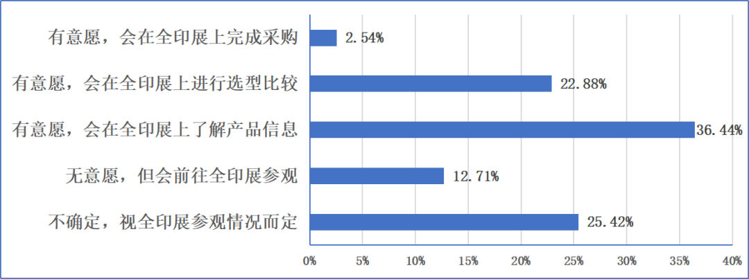 從圖14可知,有意愿在展會上完成采購、選型比較和了解產(chǎn)品信息的企業(yè)占比接近62%。其中,選擇“有意愿,會在全印展上完成采購”的企業(yè)比例為2.54%,選擇“有意愿,會在全印展上進行選型比較”的企業(yè)占比接近四分之一,選擇“有意愿,會在全印展上了解產(chǎn)品信息”的企業(yè)比例高達36.44%。有12.71%的企業(yè)雖然無采購意愿,但依然會前往全印展參觀,另有25.42%的企業(yè)并不確定是否會在展會上完成采購,將視展會的參觀情況決定。從調(diào)查結(jié)果來看,今年的全印展將成為企業(yè)投資采購的重要平臺。