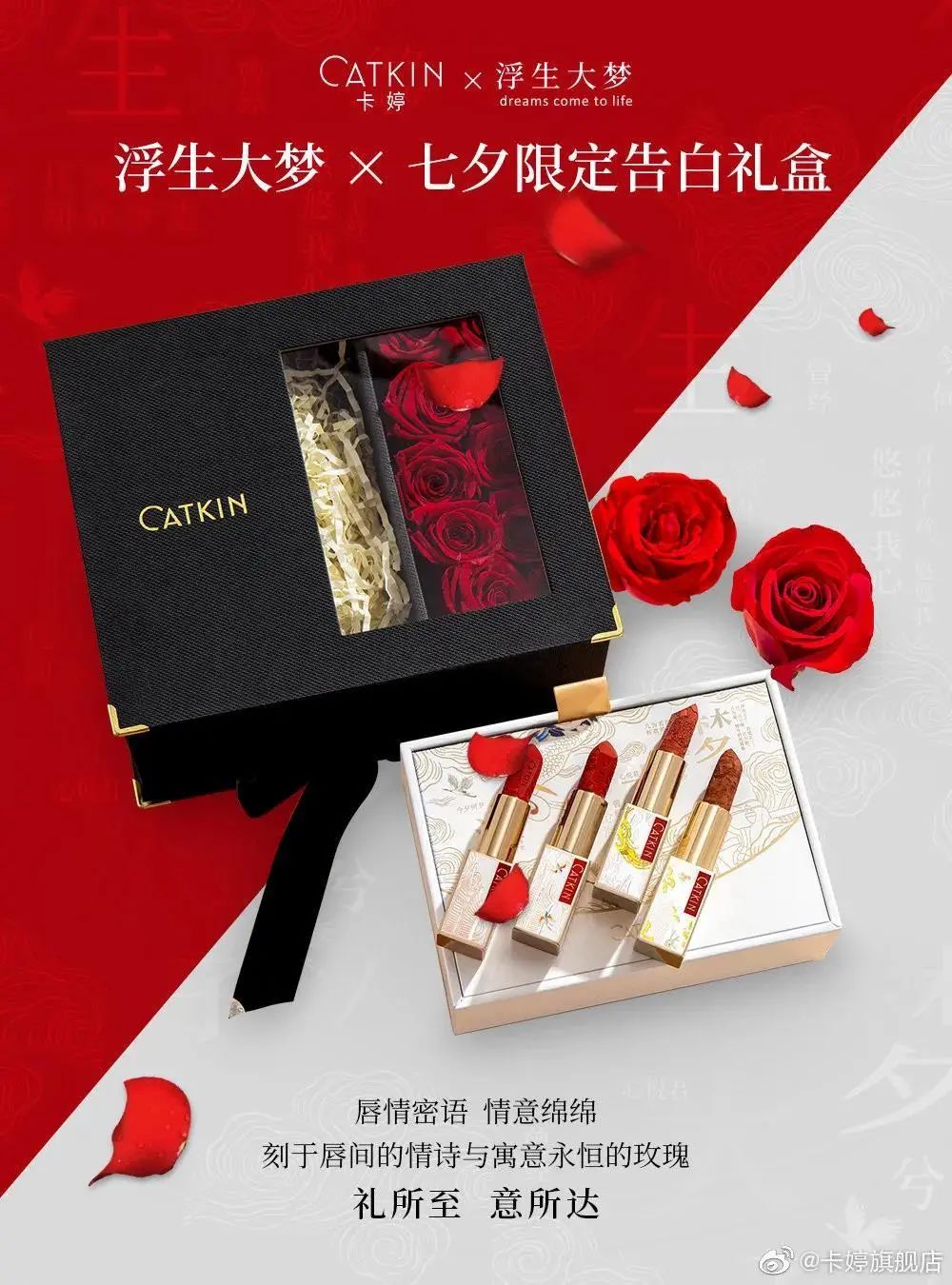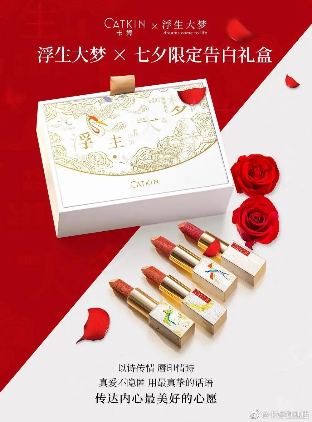 卡婷這款浮生大夢七夕限定系列,細分為“告白禮”和“紀念禮”兩款。以永生花和情詩口紅為主要產品,旨在從不同角度詮釋對“愛”的理解。