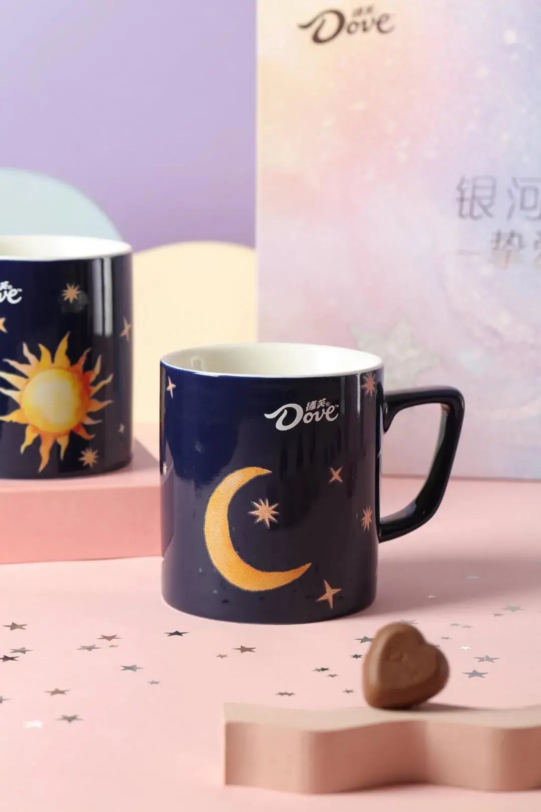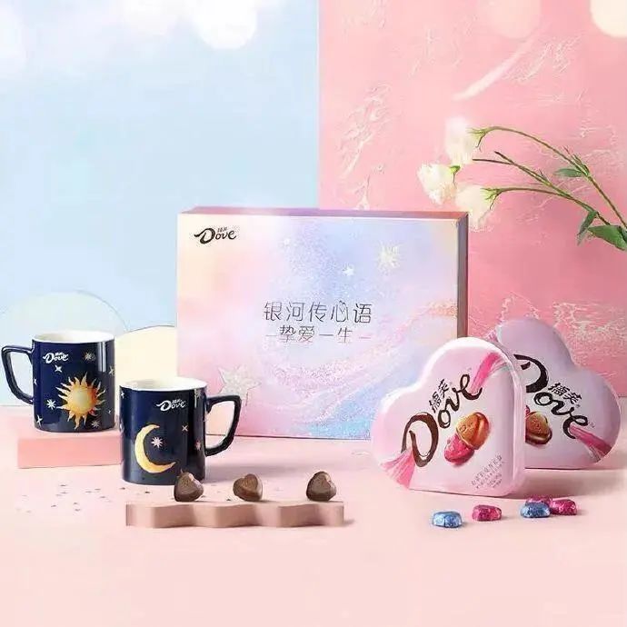 而小包裝是經典版的粉色心形形狀,絲滑的線條連接德芙的標志,中間是心形巧克力。除了禮盒和小包裝,德芙還推出了星月杯,杯子上的星星不是常規的形狀,簡單的同時又不乏一定的設計感。