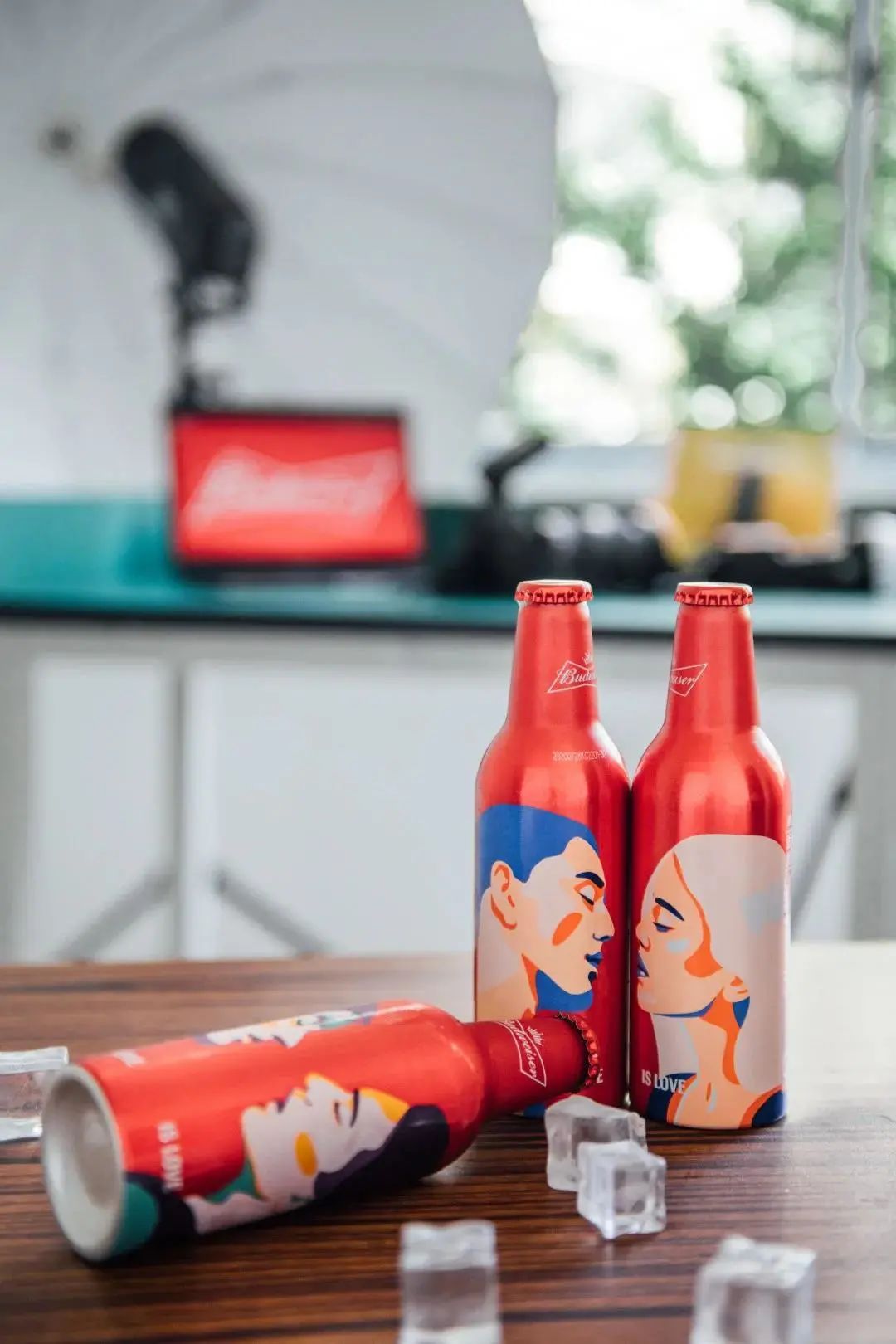 由百威和藝術家GUN KARLSSON聯合推出的七夕“親吻瓶”特別定制系列,紅色的瓶身延續經典的“百威紅”,同時以“紅”來突出了情人間的濃烈愛意。