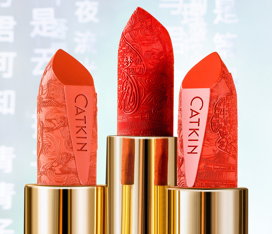 而其中的木雕刻字口紅同樣呈現出白瓷外觀的極簡國風,同時以刻金白描線條進行插畫設計。