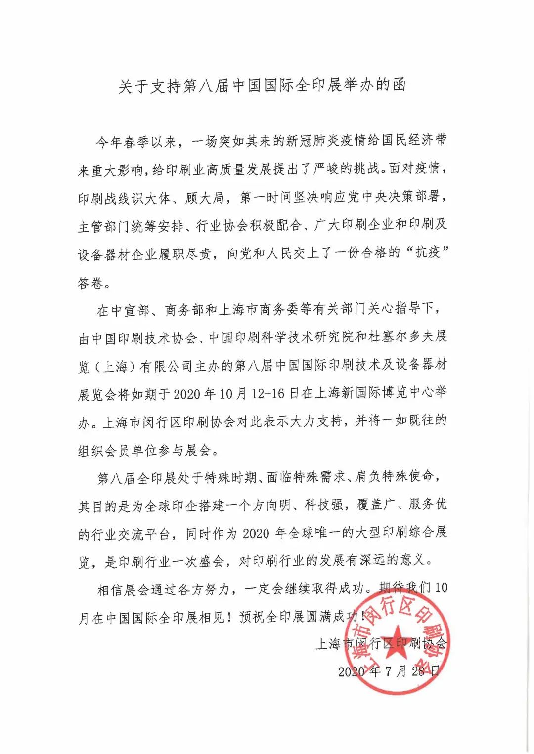 在中宣部、商務部和上海市商務委等有關部門關心指導下,第八屆中國國際印刷技術及設備器材展覽會將如期于2020年10月12-16 日在上海新國際博覽中心舉辦。上海市閔行區印刷協會對此表示大力支持,并將一如既往的組織會員單位參與展會。相信展會通過各方努力,一定會繼續取得成功。期待我們10月在中國國際全印展相見!