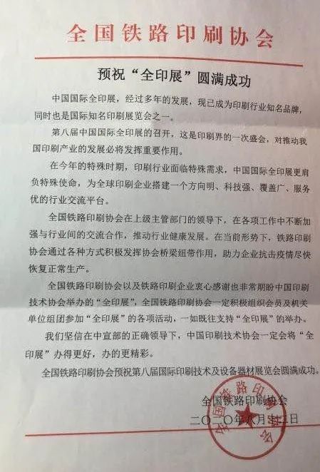 中國國際全印展,經過多年的發展,現已成為印刷行業知名品牌,同時也是國際知名印刷展覽會之一。第八屆中國國際全印展的召開,這是印刷界的一次盛會對推動我國印刷產業的發展必將發揮重要作用。全國鐵路印刷協會以及鐵路印刷企業衷心感謝也非常期盼中國印刷技術協會舉辦的“全印展”,全國鐵路印刷協會一定積極組織會員及機關單位組團參加“全印展”的各項活動,一如既往支持“全印展”的舉辦。