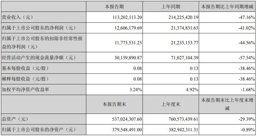 據新宏澤2020年半年度報告顯示,上半年實現營業收入1.13億元,較上年同期下降47.16%,歸屬于上市公司股東的凈利潤1260.62萬元,較上年同期下降41.02%。