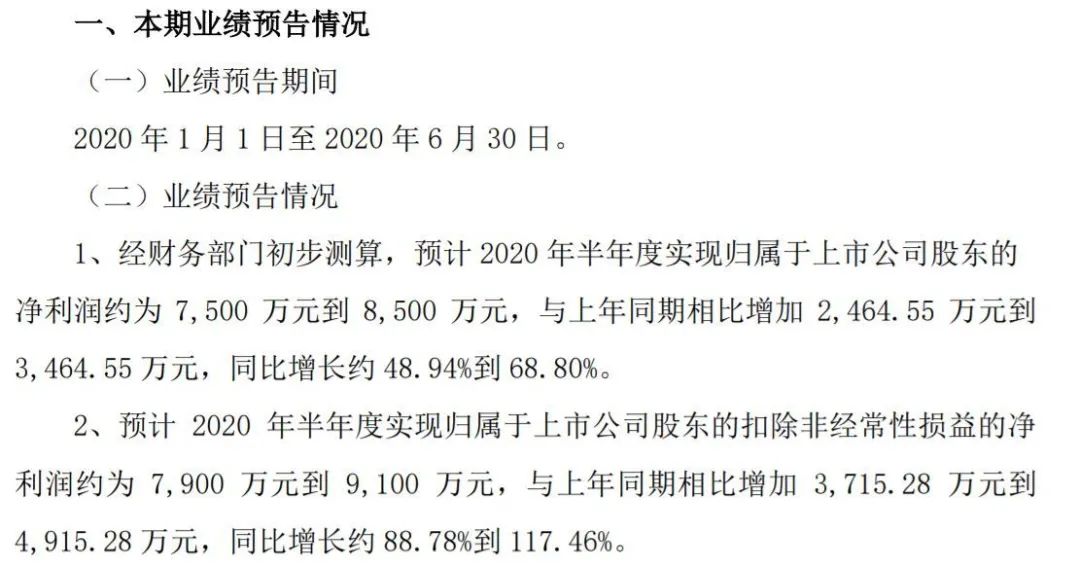 其中,預計 2020年半年度實現歸屬于上市公司股東的扣非凈利潤約為7900萬元到9100萬元,與上年同期相比增加3715.28萬元到4915.28萬元,同比增長約88.78%到117.46%。