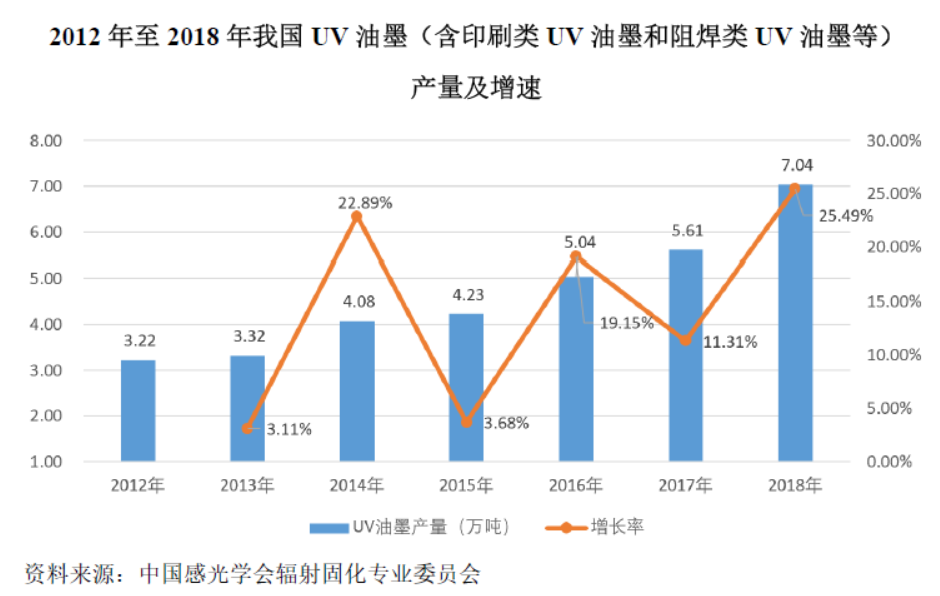公開數據顯示,2012年至2018年,國內UV油墨(含印刷類UV油墨和阻焊類UV油墨等)產量由3.22萬噸增長至7.04萬噸,年復合增長率達13.93%,遠高于國內印刷油墨行業整體3.77%的增長率。此外,UV油墨產量在國內油墨總產量的比重也由2012年的5.24%提升至2018年的9.17%。