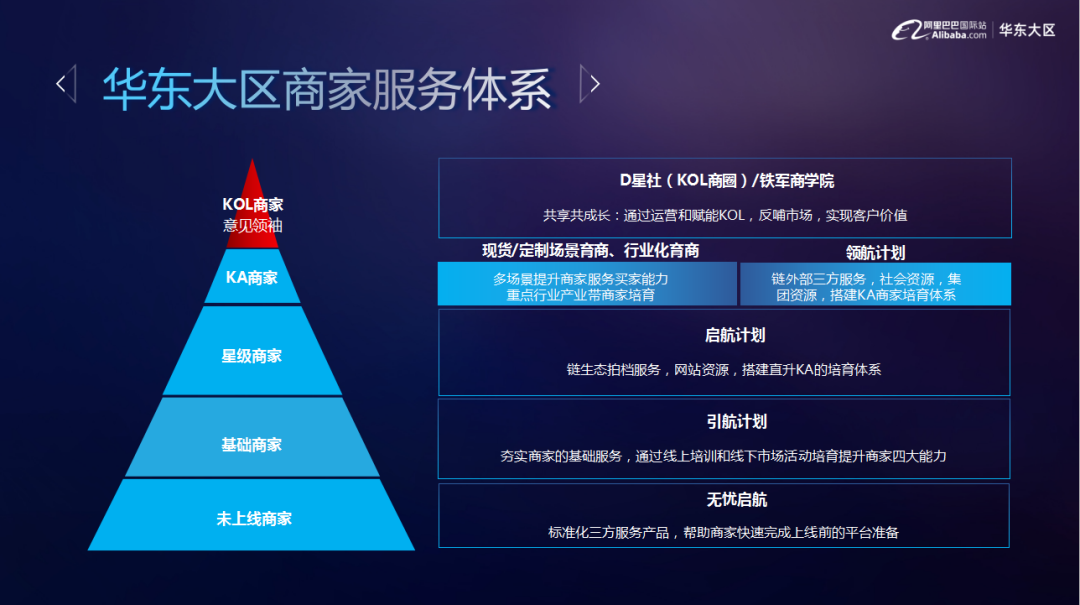 除此以外,我們會將每一個進(jìn)入到阿里巴巴國際戰(zhàn)略商家,分別列入到不同的服務(wù)體系內(nèi),并按照對應(yīng)的服務(wù)體系去執(zhí)行。以華東大區(qū)為例,整個商家類型分為未上線的商家、基礎(chǔ)商家、星級商家、KA商家和KOL商家,針對每一類的商家群體,我們都會有不同的服務(wù)體系。