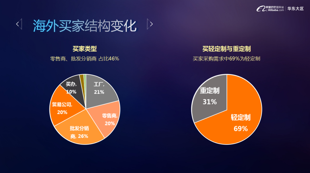 從結(jié)構(gòu)上來看,在整個買家類型中,零售商和批發(fā)商已經(jīng)占到了全體買家的46%。其中又細(xì)分為輕定制和重定制兩類,重定制在其中占比為31%,輕定制為69%。這也意味著,輕定制逐漸受到更多客戶的青睞,海外買家需要更多柔性化定制產(chǎn)品,或者說他們更需要的是外包裝的輕微變化,以此能夠快速地賣給終端的買家。這樣需求輕定制的買家群體,相關(guān)企業(yè)可以對其進(jìn)行重點(diǎn)關(guān)注。