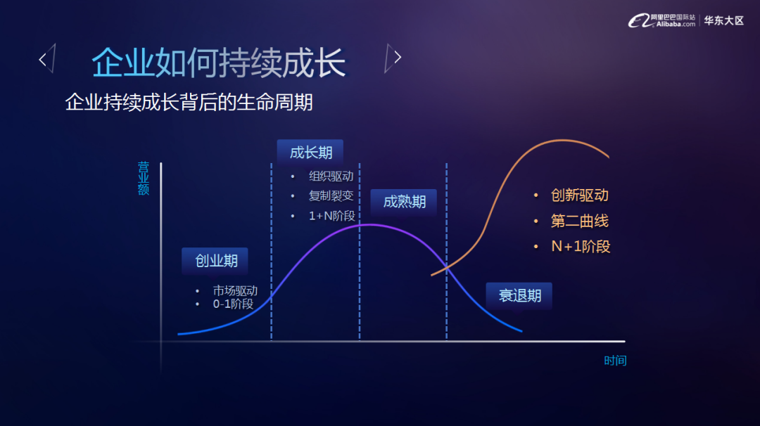 在整個的生命周期中,企業(yè)在衰退期前,或是在剛進(jìn)入到衰退期時,應(yīng)該去做哪些動作?第二曲線在這個過程中就顯得至關(guān)重要。因?yàn)檫@條曲線意味著你通過哪些方法,讓整個企業(yè)擁有更強(qiáng)大的生命能力?隨著數(shù)字經(jīng)濟(jì)時代的來臨,針對這樣的新市場和新買家,企業(yè)是否已經(jīng)做好了準(zhǔn)備,以新的方式開展業(yè)務(wù),這都是企業(yè)需要去思考的問題。