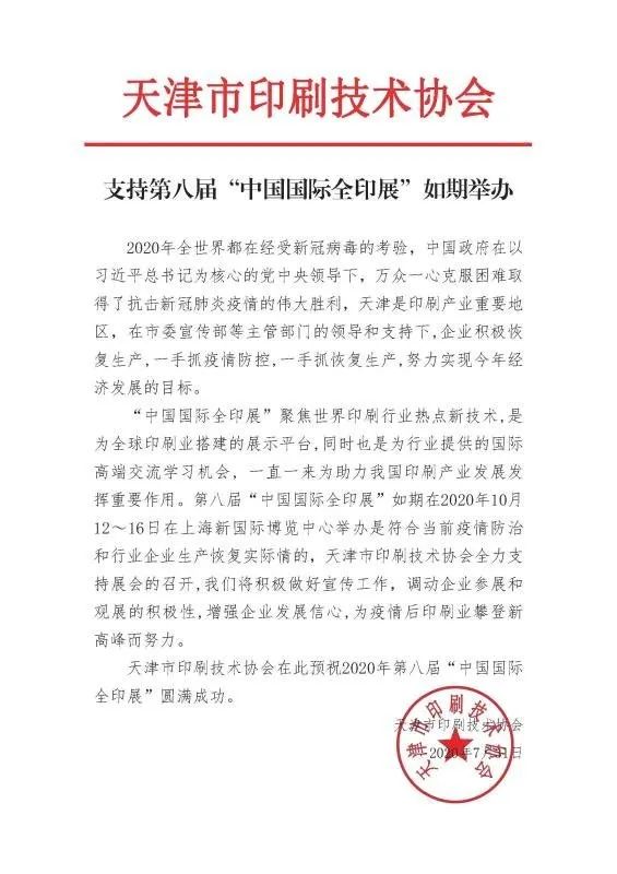 過去的17年中,中國國際全印展在全球印刷人的支持、關心和共同努力下,成長為印刷包裝領域專業化的國際性技術交流和貿易平臺,廣受業界好評。2020年10月12日-16日第八屆中國國際全印展將再次于上海新國際博覽中心如期舉行,成為疫情后印刷包裝行業新品發布、技術交流和貿易對接的首選平臺!特殊時期,以 “ 新智造 新邊界 新動能 ” 為主題的2020全印展得到眾多行業協會的鼎力支持,截止目前,本屆展會已與100余家印刷包裝協會達成了合作意向,預計將有100+協會組團參觀。上次多家協會為全印展來函打call后 全國協會鼎力支持,2020全印展蓄勢以待!我們又陸續收到了許多地區行業協會的來信,大家紛紛表示已組團成功,熱切期待著十月全印展的如期召開