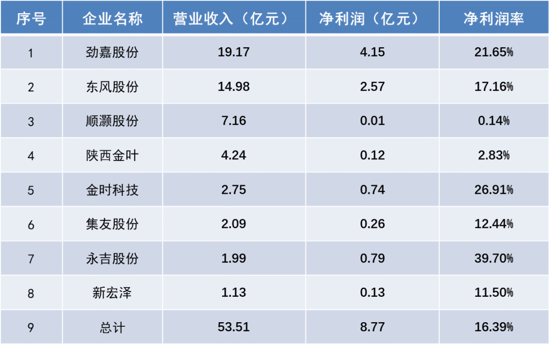 另一邊凈利潤出現下滑的分別是:勁嘉股份、東風股份、順灝股份、集友股份和新宏澤。具體情況如下:
