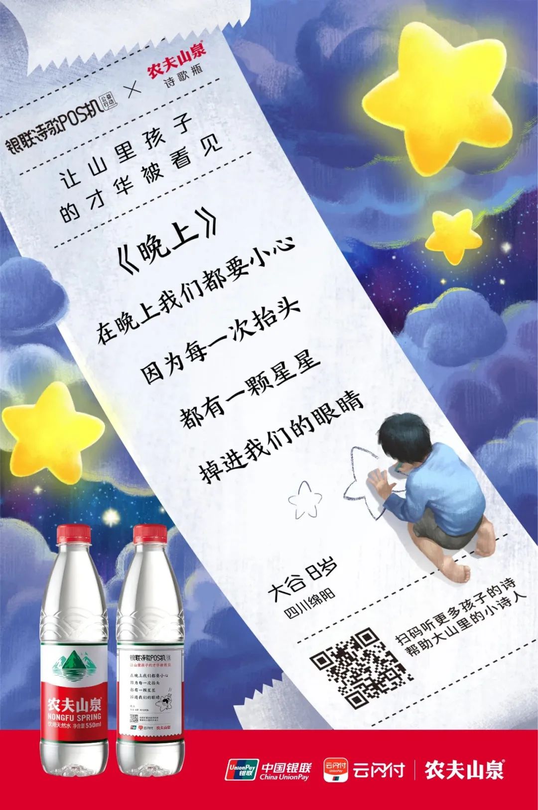 掃碼瓶身,可以聽山里的孩子讀詩,也可前往銀聯云閃付進行助力捐贈。農夫山泉在全國各大商超也設置了詩歌瓶的陳列,并在部分商超延續“銀聯詩歌POS機”的公益形式,可以花一元錢在特殊的實體POS機上買一首詩,款項將由中國銀聯捐贈給中國宋慶齡基金會。持鄉村兒童的藝術語文素養課程。