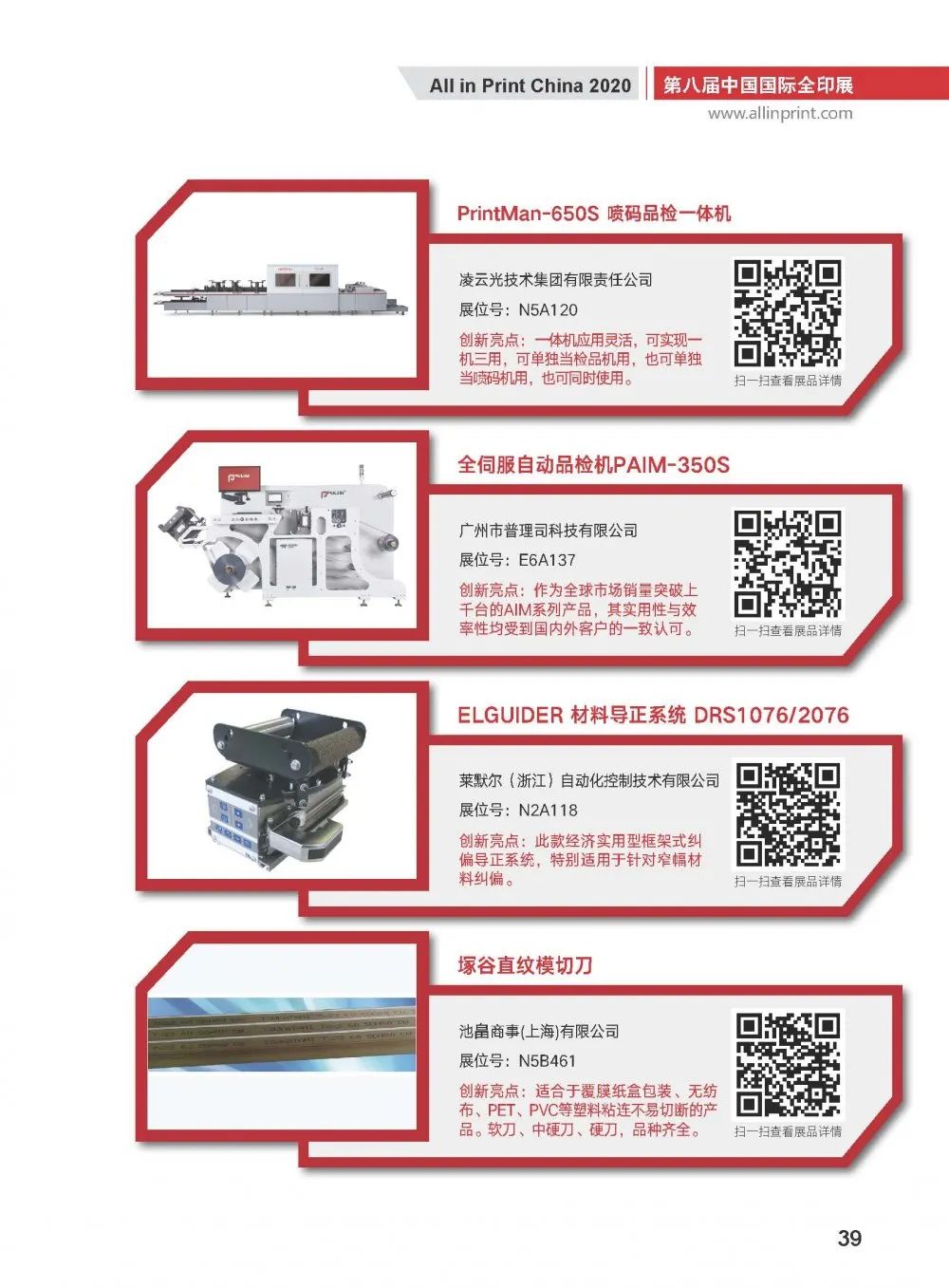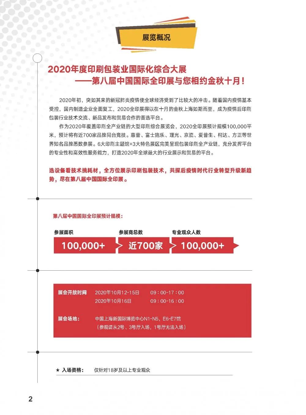 2020中國國際全印展展前預覽第1期介紹了包括印前設備及軟件服務、印刷設備及解決方案、印后及包裝設備、印刷材料以及輔助裝置、配件等覆蓋印刷行業全領域的百余家印刷包裝設備及材料供應商的部分參展展品。后續我們將持續更新發布本屆展商的展品信息,提前做好2020全印展預展服務。