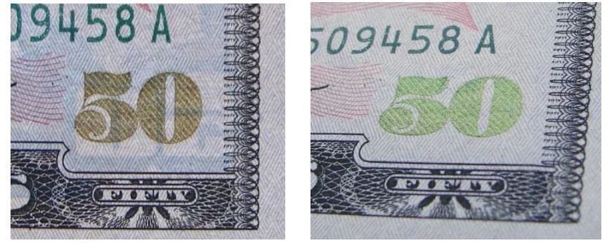 特征:油墨顏色隨著光線反射角度不同而出現變化,具有防偽功能。